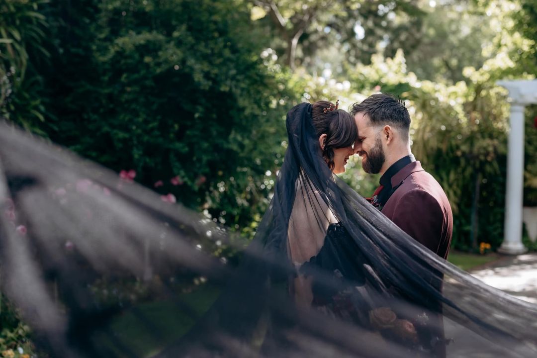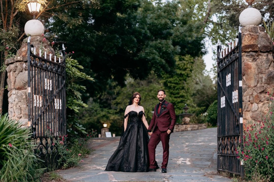 The love story of Serena and Ben began ten years ago while the pair happened to be working at the same festival. Since then, this couple’s wonderful wedding journey has been filled with moments of uniqueness! After being engaged in Canada on a skiing holiday, to winning a competition that helped cover and plan part of their special day, Serena and Ben chose a distinct look rather than a traditional wedding. Instead of a white gown, Serena wore black. Instead of delicate flower stems, there was a sword hilt. Instead of a wedding painter, the couple invited a tattoo artist. Every choice came straight from the heart, inspired by what felt true to them. Nothing reflected this more than the change on the traditional first look into a first touch; it became Serena’s favourite memory of the entire day. But in the lead up, another unforgettable moment was stepping into Always and Forever Bridal. The company offered her support without judgement for wanting something a little different. With the theme of Til’ Death, this wedding, this couple and their love story is one of dramatics – a dramatic declaration of love, exactly what love should be.